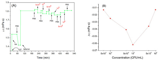 (A) the kinetics of the changes of viscosity coefficient (the value of the water viscosity coefficient is not shown in the figure to better highlight the subsequent changes) during formation of the aptamer layer and following addition of Listeria innocua (in CFU/mL). (B) Changes in viscosity coefficient depending on applied bacteria concentration in logarithmic scale. Addition of various compounds and washing the surface by water or PBS is shown by arrows.