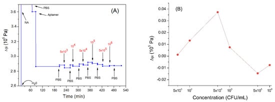 (A) the kinetics of the elastic coefficient during formation of the aptamer layer and following addition of Listeria innocua (in CFU/mL). The first three values are not shown in the graph, to better highlight the subsequent variations. (B) changes in elastic coefficient depending on applied bacteria concentration in logarithmic scale. Addition of various compounds and washing the surface by water or PBS is shown by arrows.