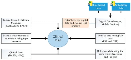 In a clinical trial, participants wear sensors and perform various predefined movements with respect to the study protocol. To give an example, axial spondyloarthritis is a condition where changes in spinal mobility mark the progression of the disease—but up to now, clinicians have lacked an accurate way of monitoring this. Figure 2 shows the various types and sources of data that can be sourced and used within a clinical trial. Patient-related outcomes (PRO) refer to Health Assessment Questionnaires (HAQ) and Bath Ankylosing Spondylitis Functional Index (BASFI) scores and clinical tests, such as the Disease Activity Score (DAS28) and Bath Ankylosing Spondylitis Disease Activity Index (BASDAI) scores. These traditional clinical trial questionnaires and tests are used by physicians for musculoskeletal assessments, such as Rheumatoid Arthritis (RA) and Ankylosing Spondylitis (AS) [26]. Sensors or smartphone apps can capture digital data that corresponds to participant movements related to a clinical trial. The data may be clinical, or ambulatory based. A filter is typically used to minimise noise or unwanted data from sensor input signals. The inclusion of a reference movement or activity dataset can be used to process data obtained for a specific study or application and used for comparisons of representative movements, such as when using Artificial Intelligence (AI) techniques.