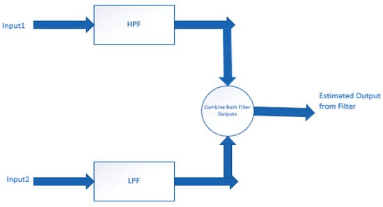 The construction of a complementary filter is shown in Figure 4. In the diagram, input 1 and input 2 represent data from two different sources, such as three-axis readings from an IMU sensor, or alternatively, an accelerometer and gyroscope when sensor orientation is unimportant. This data contains inherent both low and high frequency noise. Input 1 contains data related to relatively low-frequency noise, whereas input 2 has data related to high-frequency noise. The LPF selects a higher cut-off frequency, and any data with frequencies less than that will be routed through that module. Similarly, an HPF configured with a lower cut-off value permits all data values above that. LPF and HPF cut-off settings are determined by the input data and application [6]. If given with correct cut-off frequencies, the predicted output of a complementary filter is practically noise-free and should enable quality data to flow through the filter [35]. IMUs are used in conjunction with complementary filters to produce high-quality input data for data processing when sufficient processing is not available to implement the computationally complex Kalman filter.