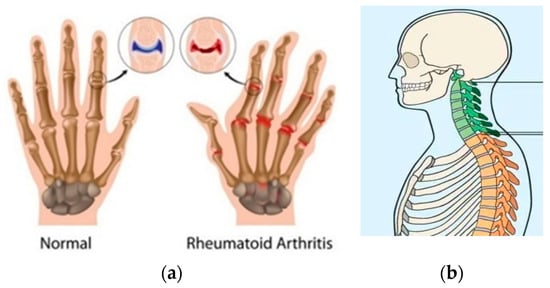 Musculoskeletal changes for (a) RA and (b) AS [64,65].