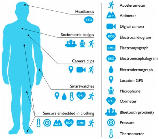 Wearable technology devices can assist the wearer in improving their sleep patterns, manage stress and increase productivity. If wearers are suffering from chronic disease conditions, these devices can provide sufficiently detailed data to monitor their disease progression [70]. Figure 6 shows a variety of wearable devices and their positioning on the human body. Headbands, sociometric badges, cameras, smartwatches and textile sensors are examples of commonly used wearable gadgets. These devices are integrated with various sensors that collect data from the human body.