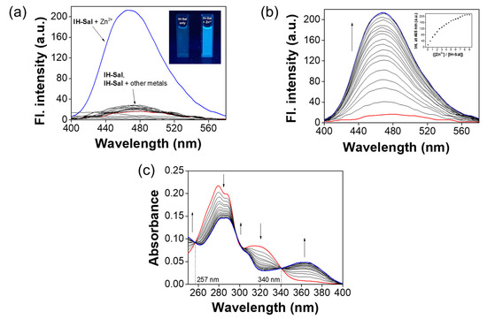 (a) Fluorescence changes in IH-Sal (1 × 10−5 M) with varied cations (8.5 equiv). Photograph: the fluorescence images of IH-Sal and IH-Sal-Zn2+ under UV light (λex: 369 nm); (b) fluorescence titration of IH-Sal (1 × 10−5 M) with varied amounts of Zn2+ (0–9 equiv); (c) UV–Visible variations in IH-Sal (1 × 10−5 M) with varied amounts of Zn2+ (0–8 equiv).