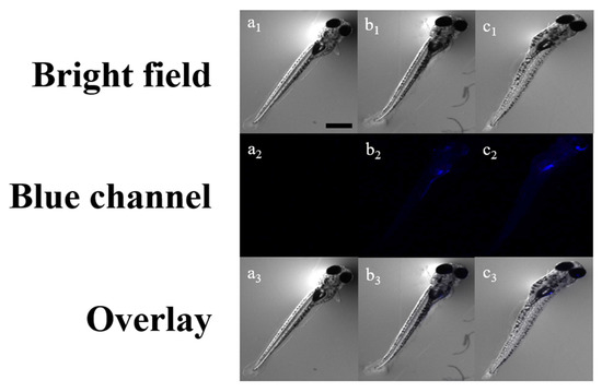 Fluorescent images of zebrafish cultured with IH-Sal followed by addition of Zn2+. (a1–a3): IH-Sal only; (b1–b3): IH-Sal with 2.5 × 10−5 M Zn2+; (c1–c3): IH-Sal with 5 × 10−5 M Zn2+. [IH-Sal] = 2.0 × 10−5 M. Scale bar: 0.91 mm.