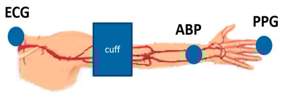 A sensor arrangement consisting of ECG, brachial BP cuff, radial intra-arterial line (ABP) and finger PPG (Figure 1) is used to collect data from two anesthetized and mechanically ventilated patients undergoing non-cardiac surgery. All sensors are standard devices common in clinical practice: Philips Comfort Care Adult Cuff [], Edwards Lifesciences TruWave disposable pressure transducer (Edwards Lifesciences, Irvine, CA, USA) [] and Philips PPG model M1191B [].
