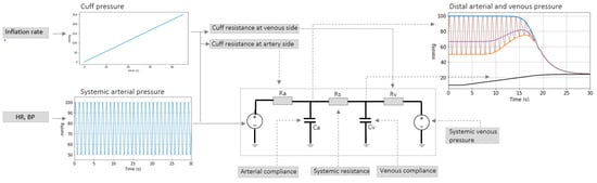 The venous thrombosis model in [] is therefore adjusted to characterize our critical care data. Figure 2 shows an overview of the adapted model. Systemic arterial pressure, cuff pressure and several parameter values are considered as input to the model. The model outputs are the distal arterial pressure and distal venous pressure. represents the resistance to blood flow over the brachial artery. Its value is estimated via the Poiseuille Equation,