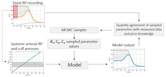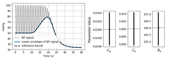 Several other parameters can be inferred by taking into account the complete BP signal recorded over the entire cuff-inflation duration. A dedicated estimator is introduced to infer distal circulation parameters of the model shown in Figure 3 arterial compliance Ca, arm vasculature resistance Rs and venous compliance Cv. The algorithm is based on standard Bayes Markov Chain Monte Carlo (MCMC) processing []. This method is chosen due to the complex interference between multiple physiological effects affecting the signal–brachial artery collapse (influenced by parameters a, c, d), artery-vein interaction (parameters τ and ), arterial venous collapse, heart and lung activity. Usage of prior knowledge and transparent interpretation of the inference results are needed.