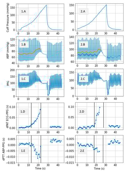 Simultaneously recorded ECG and PPG are used to compute changes in PTT due to cuff inflation over two vascular segments: Heart to finger site (Figure 4(1D,2D) and radial to finger site (Figure 4(1E,2E)).
