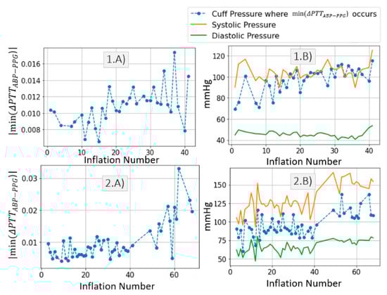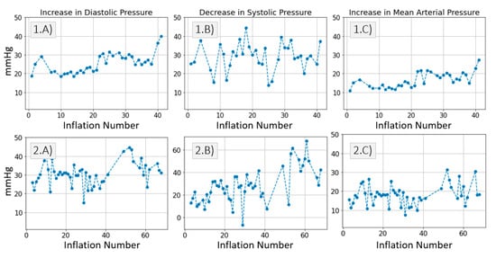 Figure 7(1B,2B) show the cuff pressure at which the maximum drop in occurs. It is found that the maximum drop in occurs when the cuff pressure increases beyond diastolic value. From this it can be deduced that the cuff inflation (and resulting distal BP increase) systematically lead to a drop in distal . Therefore, the effect cannot be attributed to other factors.