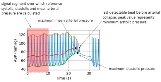 Validation of this method is preliminary and limited for now to the simulation framework. The method cannot yet be applied to our patient data, as information on d, the arterial collapse value at brachial site (Equation (3)), is not available due to uncertainties regarding arm tissue compression and cuff compliance. This is currently being investigated as part of work conducted in parallel []. Nevertheless, the simulation framework does demonstrate that ample information regarding the hemodynamic status of a patient is contained within the distal BP response to cuff inflation and that opportunities for cuff-based measurement strategies should be explored further.