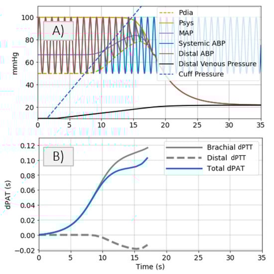(A) Simulated systemic arterial pressure, cuff pressure and resulting distal arterial and venous pressure. (B) Simulated total PAT, , and .