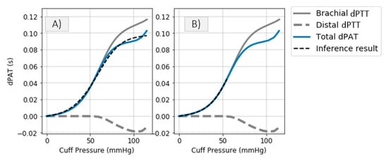 To assess the impact of distal artery effects on the correctness of the inference process, the total dPAT is fitted as described in [], under the assumption that is not influenced by the cuff inflation. Figure 9A shows the fit result with a dotted black line. The inferred a value is 0.012 and the inferred c value is 0.08, corresponding to an error in a inference and c inference of over 50% and almost 20%, respectively. Therefore, changes in distal arm circulation are not negligible as assumed until now.