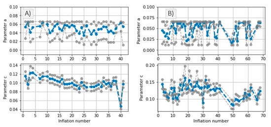 Inference results of the parameters a and c per inflation; (A) Patient1 data and (B) Patient2 data. Blue represents the central tendency of the posterior distribution, gray represents the 95% HDI.