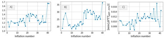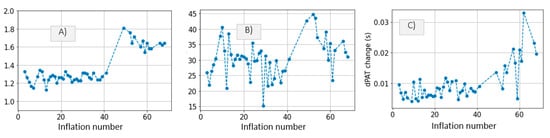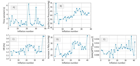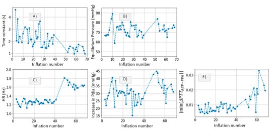 Figure 19A,B show the τ and inference results for Patient2. A decrease in τ is observed at inflation fifty. Significant changes in HR, maximum Pdia increase and maximum drop in are also observed around inflation fifty. It is clear that at the time of inflation fifty, the hemodynamic status of Patient2 is altered. However, the correlation between hemodynamic variables is slightly different from Patient1. The change in the hemodynamic status is not clearly visible when analyzing the values. A distinguishable change in τ, however, is observed at inflation fifty.