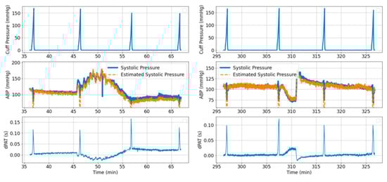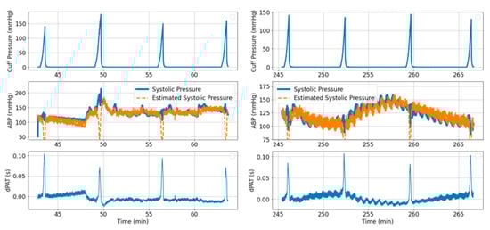 To illustrate the algorithm performance, Figure 14 and Figure 15 shows examples of BP prediction over a total of six time segments obtained from Patient1 and Patient2 data, respectively.