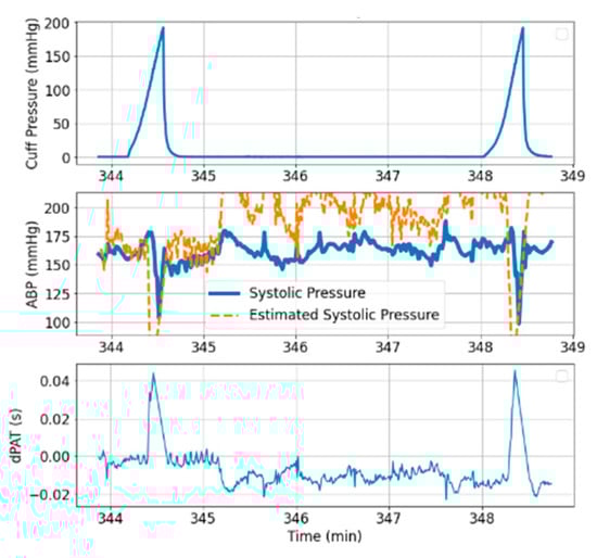 Also, the presented PAT-based BP estimation is intended for patients that are not monitored invasively. The method might perform better during less invasive OR procedures, or during ICU monitoring, where hemodynamic alterations are expected to be less frequent and less abrupt, allowing for more accurate measurement of cuff-induced effects on the vasculature. Also, the absence of motion artifacts caused by invasive interventions would increase the reliability of the PAT-based BP estimation.