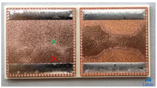 Photo of some of the soldered and cleaned DBC samples. The left-hand side shows Set7 after cleaning, and the right-hand side shows it before cleaning. The red point marks measuring Spot A, and the green point marks measuring Spot B.