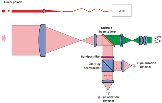 The concept relies on the standard polarization beamsplitter cube and two separate detectors—one responsible for s and the second for p polarization. Polarization axis direction of the beam (linearly polarized laser is applied), is alligned with the beamsplitter in such a way, that in case of no depolarization of optical echo, only s detector receives signal. On the other side, if echo is completely depolarized, one is tempted to say that both detectors would receive the equal power levels. Indeed, it would happen, however in case of the dichroic beamsplitter absence. In our system, dichroic beam splitter induces constant and deterministic depolarization factor. According to this scheme, in order to evaluate the discussed depolarization effects quantitatively, we introduced cross-polarization ratio δ defined as