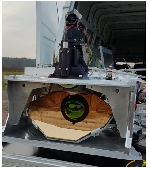 The anti-drone scanner was designed and its prototype was created according to the discussed optical configuration (photography of the developed system in Figure 4). The platform is based on fiber pulsed laser operating at 1550 nm wavelength. Additionally, the dedicated software environment was developed. This prototype was used to perform a lot of experimental work both in a field and in a lab. It was our intention to collect parameters of the measured objects, not in the lab on some other apparatus, but applying directly the constructed device. In such approach, the results are affected by all the hardware constants specific for this instrument. Accordingly, we do not have to take care of the correction factors which would be the case upon transferring depolarization signatures from lab measurements to the scanner.