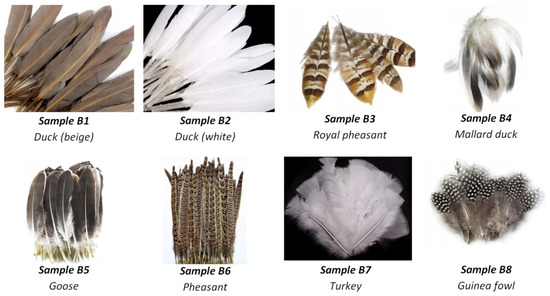 First of all, the theoretical maximum detection ranges were confirmed in real conditions. Secondly, the depolarization signatures of drones were collected. So far, we have not arranged experiments with real birds flying in the air, however numerous targets prepared with a whole variety of feathers were fabricated. Each such target has been thoroughly investigated in terms of its cross-polarization ratio δ resulting from different orientations of its surface with respect to the laser beam direction. In effect, we collected the valuable statistics of depolarization signatures representing both drones and birds. In order to prepare the samples representing birds, we used the natural feathers of the species listed in Figure 5. On the other side, samples associated with UAV-type objects have been presented in Figure 6.