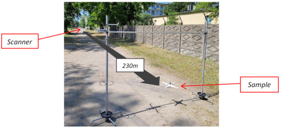 The experiments were performed in open terrain. Scanner was located in the distance of 230 m from the place where samples could be swapped (Figure 7). Such distance allowed to obtain 25 cm laser spot—sufficient size to average spatial irregularities effects of the samples. Additionally, the detection electronics could work at nominal settings, which would be not possible in shorter ranges, due to saturation.