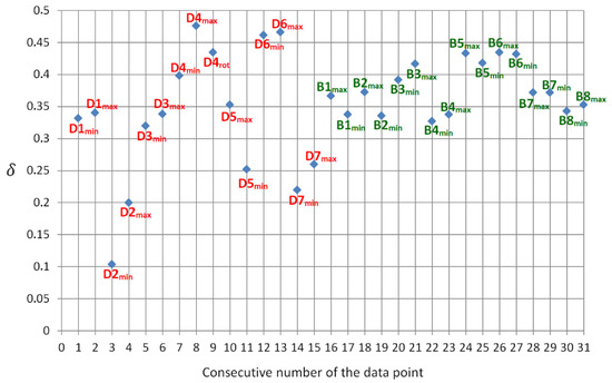 Each sample was measured in several angular orientations, in order to verify also the impact of this geometrical aspect. We changed the sample orientation in order to find the maximum and minimum level of the measured cross-polarization ratio. The results are summarized in Figure 8. It shows, for each measured sample, the obtained extreme values of δ.