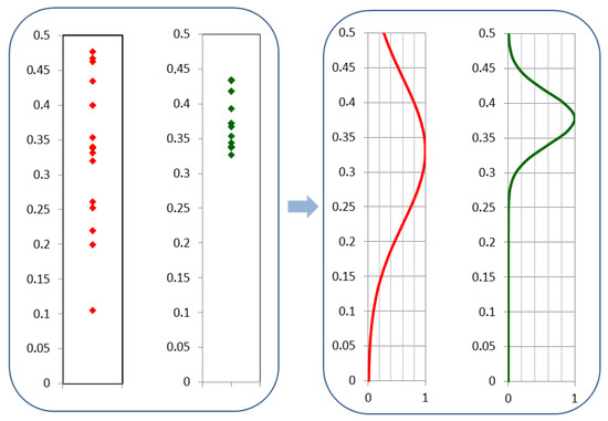It proved a large discrepancy especially in terms of standard deviations σ (0.105 vs. 0.037). The distribution associated with birds is significantly more tightly focused around its mean value. It corresponds to potential classification methodology. Namely, one can state that if the measured (by the developed scanner) cross depolarization ratio of unknown airborne object, is close to 0.38, at high probability it is a bird and at lower probability it is a drone. On the other side, if the obtained δ is far from 0.38, at high probability it is a drone and at lower probability it is a bird. Taking another example, if the measured value of δ goes below 0.27 level, there is very high probability, that drone was detected. Such approach is obviously not deterministic, since the obtained results revealed meaningful overlap between both data groups. Let us consider the unnormalized Gaussian distributions f(δ) associated with both data sets (Figure 10).