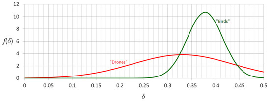 Probability density functions of δ (drones curve—in red, birds curve—in green).