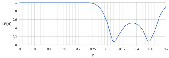 The plot of this function is presented in Figure 11. It can be interpreted as an indicator of the δ ranges, where the discrimination between drones and birds is efficient (ΔP ~ 1) and those δ ranges, where the a.m. discrimination potential is reduced (ΔP < 1).