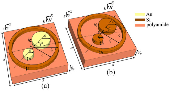 Layout of the proposed metasurface unit cell in (a) the silicon-gold and (b) the all-silicon configurations. The two cylinders with radii and are placed with the centers along an axis rotated with an angle with respect to the axis.
