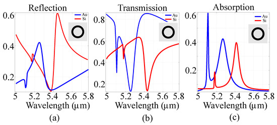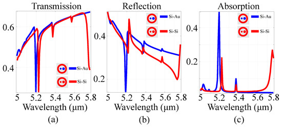 From the data, it can be observed that the change in transmission and reflection is significant in the two configurations, with two pronounced resonance peaks in the 5–5.6 m window. This behavior is dictated by the ring geometry rather than the materials used. However, in the silicon ring configuration, the response features a new resonance peak at approximately m, along with a relative shift in the resonance peaks. For both reference cell configurations, the absorption profiles exhibit multiple symmetric, Lorentzian-shaped resonances [58]. The multiple sharp peaks in the absorption spectrum for the hybrid silicon-gold architecture can also be attributed to the hybrid meta-molecule, which combines the continuous transition band of gold with the discrete interband of silicon [59].