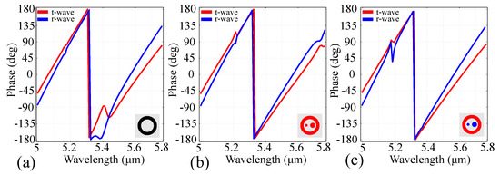 Based on the results, a frequency-selective behavior was observed for both materials, with resonances at m and m in the case of the gold ring. For the silicon ring, resonances shifted to m and m, with an associated change in absorption amplitudes. Moreover, in the metallic architecture, changing the material from gold to silver, copper or tungsten does not yield any considerable shift. This is due to the fact that the value of the electric conduction of the metallic parts does not change significantly. Moreover, since metallic metasurfaces exhibit significant heat dissipation losses and weak phase coverage, they are mostly used as proof-of-principle demonstration. In devices, either semiconductor or hybrid semiconductor-metal architectures are preferred. To wit, we have performed spectral investigations on the full structure presented in the previous section, in two situations: one where all parts are constructed out of silicon and another where the ring is constructed out of silicon and the inner cylinders are constructed out of gold. The spectral behavior is presented in Figure 3.