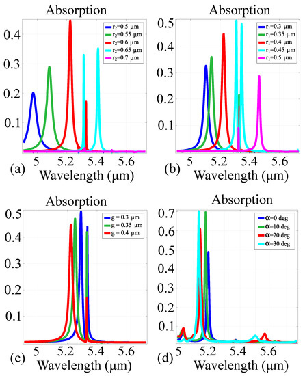 Absorption tuning curves of the hybrid silicon-gold cell as a function of various degrees of freedom: (a) tuning curves for a variation of the large cylinder radius ; (b) tuning curves for a variation of the small cylinder radius ; (c) tuning curves for a variation of the substrate thickness ; (d) tuning curves for a variation of the cylinder inclination axis angle . For the variation of one parameter, all other ones have their values corresponding to the reference configuration.