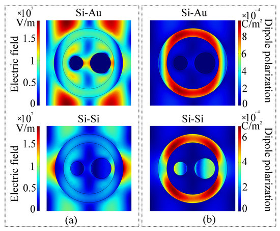 (a) Electric field norm and (b) induced dipole polarization in the metasurface plane taken at the dominant resonance frequency of the gold−silicon and all−silicon configurations.