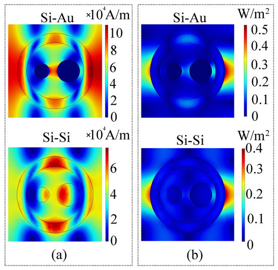 (a) Magnetic field and (b) average power flow of the wave induced by the metasurface elements in the gold-silicon and all-silicon configurations.
