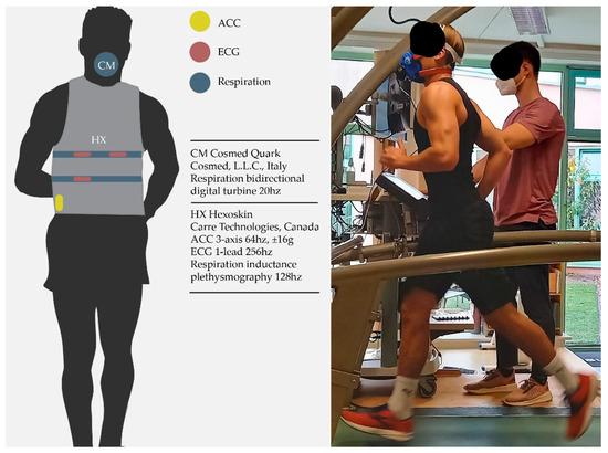 Experimental sensor setup with reference spirometer setup and Hexoskin smart shirt. ACC: accelerometer, ECG: electrocardiogram, CM: Cosmed, HX: Hexoskin.