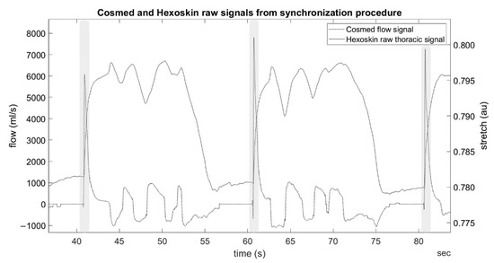 Raw CM flow and HX thoracic signal data were exported in .csv format and processed via a custom MATLAB routine (MATLAB R2021a, The MathWorks Inc., Natick, Massachusetts, USA). First, the signals were upsampled via linear interpolation to a common frequency (128 Hz). Then, synchronization was performed by detecting the average time lag between all three peaks in the CM flow signal versus the peaks in the first derivative of the HX thoracic signal (Figure 2). The mean time lag was used to calculate the synchronization value, and the standard deviation of the time lags was used to calculate a synchronization error value. The difference between the first and second sync was calculated to quantify any sensor drift, and any detected drift was corrected manually.