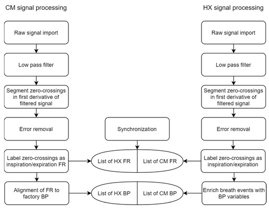 Raw HX data were analyzed in a similar routine as above. Signals were filtered with the same procedure as CM; then, zero crossings were detected in the first derivative of the thoracic signal, as each FR occurs near signal peaks and valleys (Figure 4). For error correction, a routine similar to that reported by [12] was implemented; each FR was “scored” via three characteristics: (1) time from last FR, (2) positive or negative slope, and (3) signal magnitude. Then, FR were flagged as “false” if: (1) more than 60% shorter than the average time difference of last five FR or (2) they were first in a short (<0.5 s) double event (same slope sign) (Figure 5). These “false” events were manually checked before elimination. Each FR was labeled as inspiration or expiration according to the signal peaks and valleys, respectively. The list of FR was then used to enrich the dataset with the following features for each breath: time of inhale (tI; time from each peak to valley), time of exhale (tE; time from each valley to peak), tB (sum tI+tE), BR (60/tB), and ds (tI/tB). BR variability (BRV) was calculated using the coefficient of variation (CV) of tB over five breaths [13,14].
