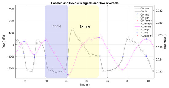 Example Cosmed and Hexoskin signals and detected flow reversals from one trial. No false flow reversals were detected in this signal example. Annotated “exhale” and “inhale” breath phases are approximate representations of breath phase determination by the algorithm. CM: Cosmed, HX: Hexoskin, filt: filtered, insp: inspiration, exp: expiration, au: arbitrary units; fr: flow reversal.