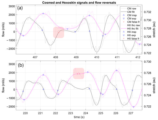 Example Cosmed and Hexoskin signals and detected flow reversals from one trial. Note false flow reversals labeled for removal. Cosmed error is labeled in (a) and Hexoskin false positives in (b). CM: Cosmed, HX: Hexoskin, filt: filtered, insp: inspiration, exp: expiration, fr: flow reversal.