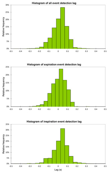 Histogram of event detection lags for full dataset, expiration, and inspiration events.