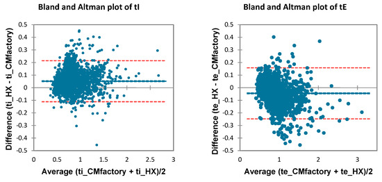 Despite the potential for the HX and algorithm to calculate the BP components of timing (tI, tE, ds) and BRV, our results did not show good agreement with the criterion. This is perhaps caused by HX overestimating tI and underestimating tE systematically at longer tB (Figure 8). However, this error does not explain the lack of agreement in BRV, since it is calculated per-breath from the CV of the previous five tB. Individual analysis indicated that two individuals had significant tB deviations reflecting periodic deep breathing while running; this was seen to substantially increase the relative measurement error within this sample. Rather, the CM and HX differed in how they measured extra-long breaths. This behavior is not simply a statistical outlier, but indeed reflects an important clinical phenomenon that is reflected in BRV [30]. Periodic deep breaths cause measurement method differences; more sensitive techniques are needed to detect these important BP phenomena and qualify their measurement accuracy, such as machine learning or various complexity metrics [29].