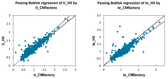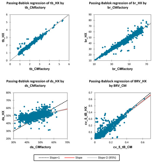 - Passing, H.; Bablok, W. A new biometrical procedure for testing the equality of measurements from two different analytical methods. Application of linear regression procedures for method comparison studies in clinical chemistry, Part I. J. Clin. Chem. Clin. Biochem. 1983, 709–720. [Google Scholar] [CrossRef]