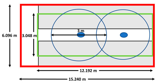 Garden dimensions: gardening area in gray; MDHS coverage green inner rectangle; and Polhemus sensor coverage two overlapping blue circles.