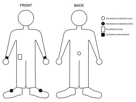 A diagram of the sensor locations on the participant’s body. The Polhemus G4 sensors (circles) are attached to each shoe and to the participant’s back, the Polhemus G4 hub is worn on the waistband, and the ActiGraph GT9X sensors (squares) are worn on the wrists.
