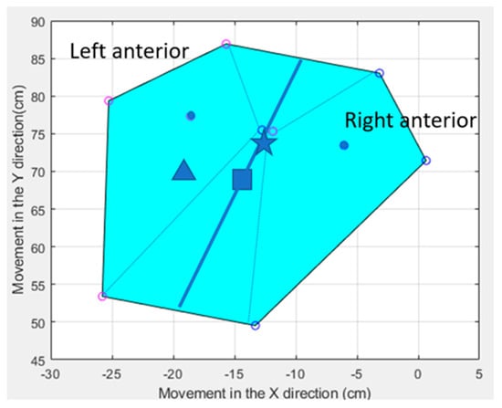 This figure shows two superimposed points in time where P3′s feet have not moved but he has moved his COM over his BOS. The BOS is the shaded area formed by the two feet. The sensor position is the solid circle on each foot; the open circles represent the edges of each foot based on measurements inputted into the code relative to the sensor position. The square is the center of the irregular polygon as calculated by the code. The star is COM 1, and the triangle is COM 2.