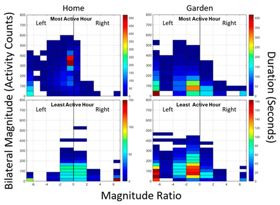 where the bilateral magnitude is the summation of the vector magnitudes of acceleration for both arms [18]. The bilateral magnitude indicates the intensity of movement, with a larger bilateral magnitude corresponding to a more strenuous or intense movement, and the magnitude ratio reflects the comparative usage of each arm. A negative magnitude ratio indicates that one arm was used more than the other, and a positive magnitude ratio indicates the opposite, with values further from zero indicating a greater discrepancy between arms. A magnitude ratio of zero indicates that both arms were used the same amount. The density plot component of the activity trees represents the total duration of movement performed by the participant by reflecting the frequency at which that value occurs, where warmer colors represent longer duration, with dark red being the longest, and cooler colors represent shorter durations, with dark blue being the shortest.