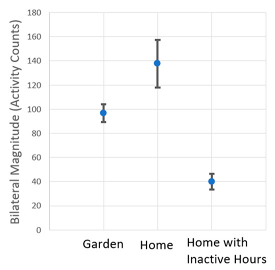A visual t-test (Figure 5) shows the intensity of activity in the different settings. The median bilateral magnitude, excluding periods of zero activity, was calculated for each gardening session (Garden), each of the eight hours of maximum activity from the home environment (Home), and all waking hours when at home (Home with inactive hours). Figure 5 displays the mean and standard error of the median bilateral magnitudes for the garden and two home environments; it was highest in the active hours at home and lowest during all waking hours at home. However, the activity level in the garden as compared to the active hours at home was more consistent; the median bilateral magnitude often differed highly between the most active and second most active hours at home, leading to the higher standard error for the active hours at the home environment as compared to the garden for the garden.