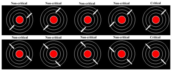 The Hitchcock ATC Task was designed to test theories surrounding sustained attention, workload, and performance, within a standardized controllable task that is relatively more representative of the real world [53]. Stimulus of a filled red circle and three concentric white circles are continually displayed to the participant. Two white line segments are then displayed over these stimuli in different configurations, as seen in Figure 1. The red circle represents a city, and the white line segments represent aircraft. Participants are instructed to respond (through press of a key on a keyboard) only if the two jets are on a collision course with one another, i.e., the white lines are colinear. If they are, this is a critical event, and a small minority of trials are critical events (3.3%), the rest being non-critical as seen in Figure 1. The stimulus appear every 2 s and only remain on screen for 300 ms.