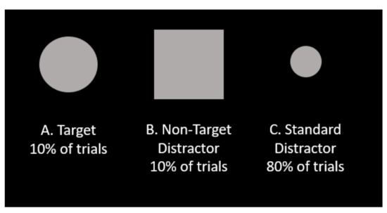 The 3-Stimulus Oddball Task was designed to assess how individuals discriminate targets, non-target distractors, and standard distractors, in various challenging scenarios [51]. In this task, three different visual stimuli can appear: targets, non-target distractors, and standard distractors. Targets and non-target distractors each appear separately in 10% of trials, and standard distractors appear in the remaining 80% of trials. As seen in Figure 2, the target is a large circle, the standard distractor a small circle, and the non-target distractor a large square. Stimuli are every 2 s with a 75 ms duration. Participants are instructed to respond only to targets by pressing a response key on a keyboard, ignoring non-target distractors and standard distractors.